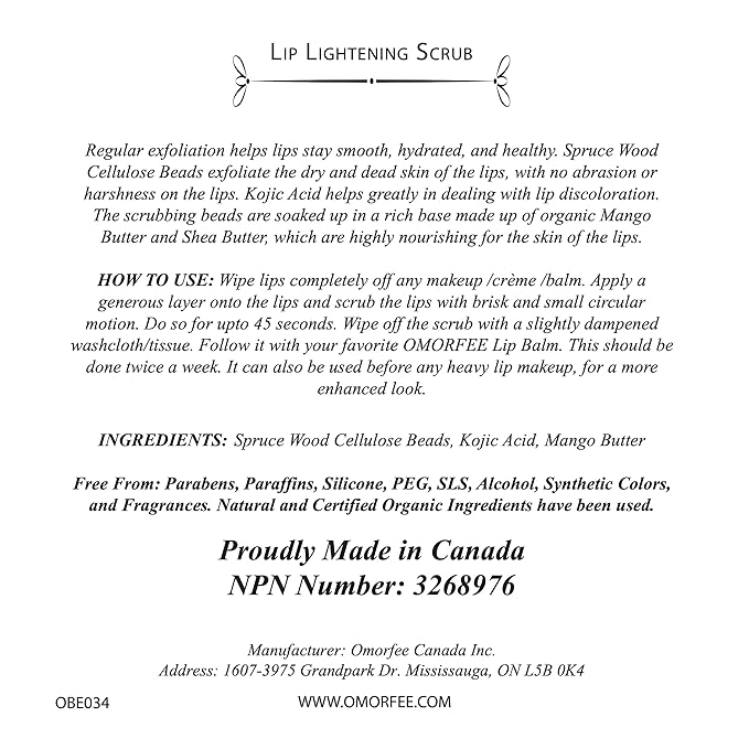 - HOW TO USE: Wipe lips completely off any makeup /crème /balm. Scoop a pea-sized amount from the tub and apply on to the lips. Scrub in brisk, small circular motions for up to 30 seconds. Wipe off the scrub with a slightly dampened cotton pad. Follow it up with your favorite OMORFEE Lip Balm. Use the Lip Scrub 2-3 times a week for best results.