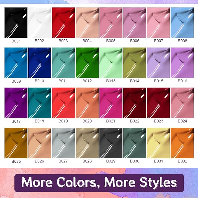 - Gel Nail Polish Set: Gel nail polish with 32 colors can match various styles for various occasions. There are classic black, white, and red colors that can be easily paired. There are light colors such as light yellow, sky blue, and they are suitable for summer, as well as dark colors suitable for winter, which can be used throughout the year.