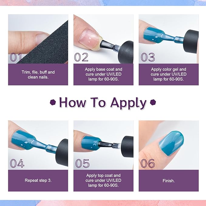 - Use: Before using gel nail polish, use the nail drill to clean and recuperate the nail surface. After using, cooperate with the nail lamp to achieve a better color fixation effect, which can be retained on the nail for a longer time. Gel nail polish is made of natural resin, health minerals and other ingredients. Tested by professional personnel to effectively ensure product safety. It is very safe to use.