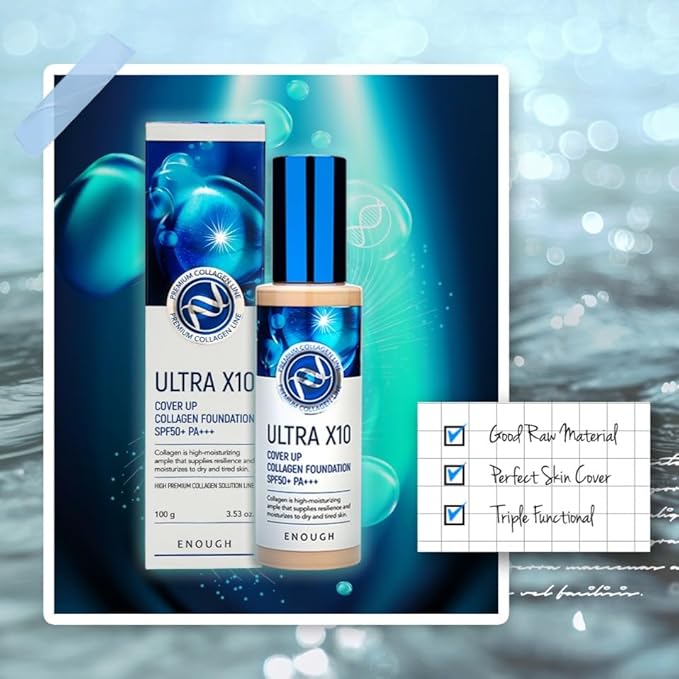 - Recommended Uses For Product : Daily Sun Protection: Use the Enough Ultra X10 Cover Up Collagen Foundation daily to protect your skin from harmful UV rays with SPF 50+ PA+++, preventing sun damage and premature aging., Hydrating Moisturizer: Acts as a hydrating moisturizer, keeping your skin nourished and moisturized throughout the day, making it perfect for dry skin types., For face, Anti-Aging Benefits: Infused with collagen, this foundation helps to improve skin elasticity and reduce the appearance of fine lines and wrinkles, promoting a youthful and radiant complexion. Daily Sun Protection: Use the Enough Ultra X10 Cover Up Collagen Foundation daily to protect your skin from harmful UV rays with SPF 50+ PA+++, preventing sun damage and premature aging., Hydrating Moisturiz⦠See more
