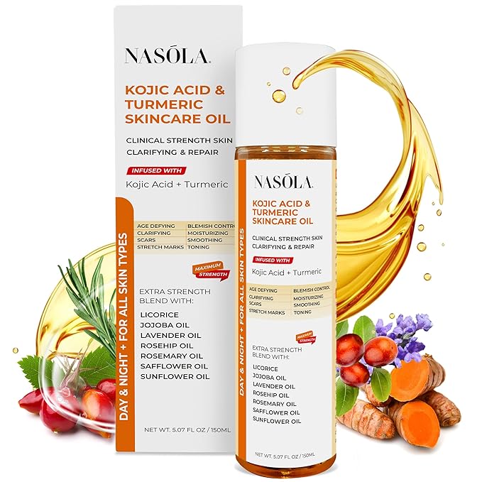 - Natural Potency for All Skin Types: Crafted with a unique blend of Rosemary Oil, Safflower Oil, and Sunflower Oil, Nasola Kojic Acid Turmeric Skincare Bio Pure Oil promises care that's gentle yet effective. Safe for face and body application, this Turmeric Oil for body and face caters to all skin types, ensuring everyone can experience its remarkable benefits.