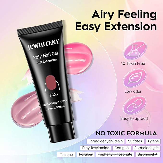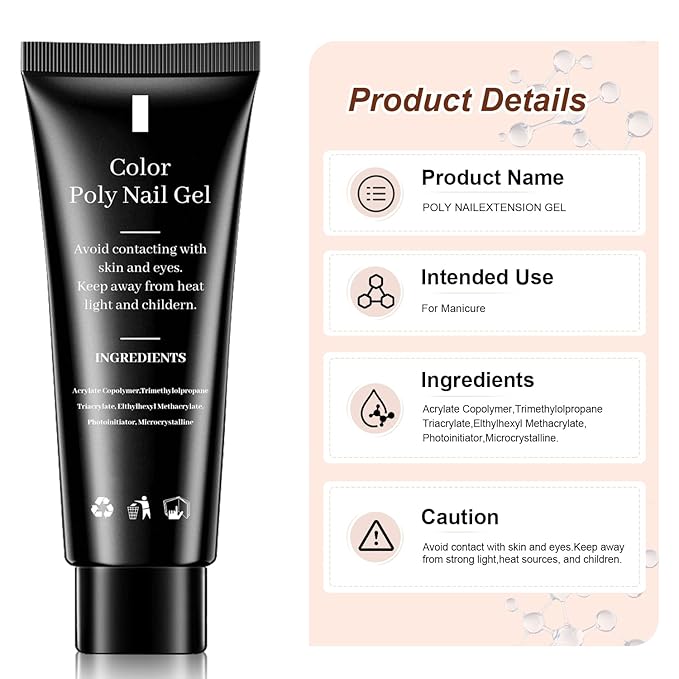 - [ EASY TO USE]: Say goodbye to tedious operations, the gel is smooth and easy to push, and it is easy to shape.You wonβt struggle to try to use our poly nail gel kit. The instructions for using the extension gel are detailed and yet simple to understand.If you want to change the nail art style and remove the nail extension gel, you can file the nail extension gel down and then buffer it.A nail drill machine will save you time and help to remove the nail in a faster and cleaner manner.