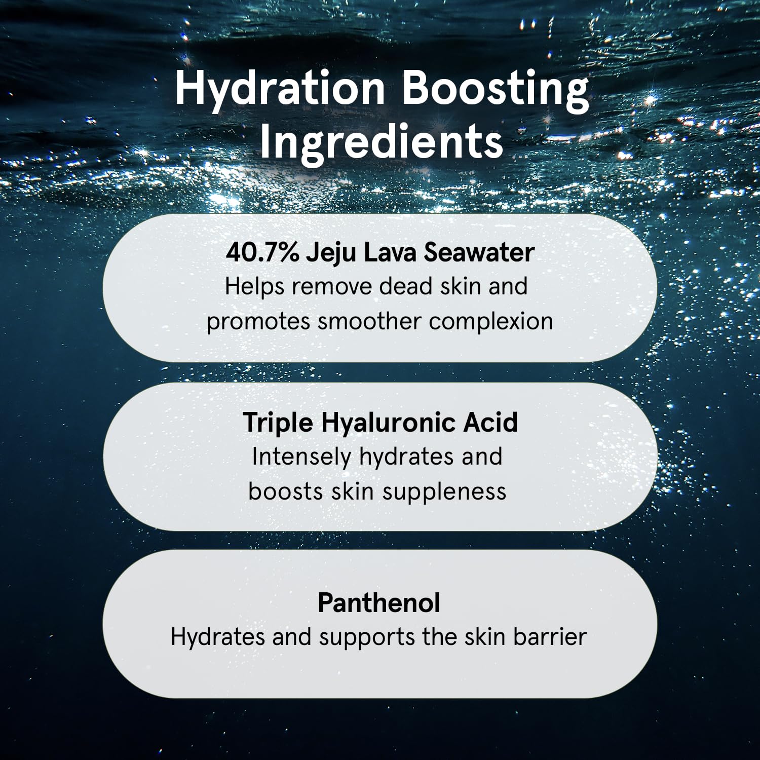 - FORMULATED WITH 40.7% JEJU LAVA SEAWATER: Containing Jeju Lava Seawater, which is rich in minerals and nutrients, this essence helps to prevent skin dryness and increase moisture, improving the texture of rough skin and leaving it smooth and soft. Patented Triple Hyaluronic Acid and D-panthenol repair damaged skin barrier and make it healthier