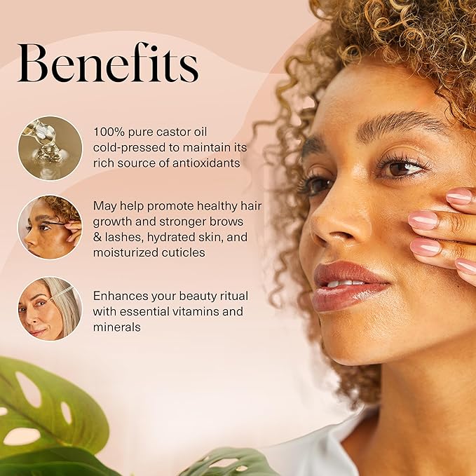 - PACKED WITH ESSENTIAL NUTRIENTS FOR HAIR & SKIN CARE: Rich in vitamins, minerals, and fatty acids, castor oil is renowned for reducing inflammation, hydrating, and boosting hair and skin vitality. Regular use nourishes, strengthens, and enhances the appearance of hair, lashes, brows, and skin for a healthier, radiant look.
