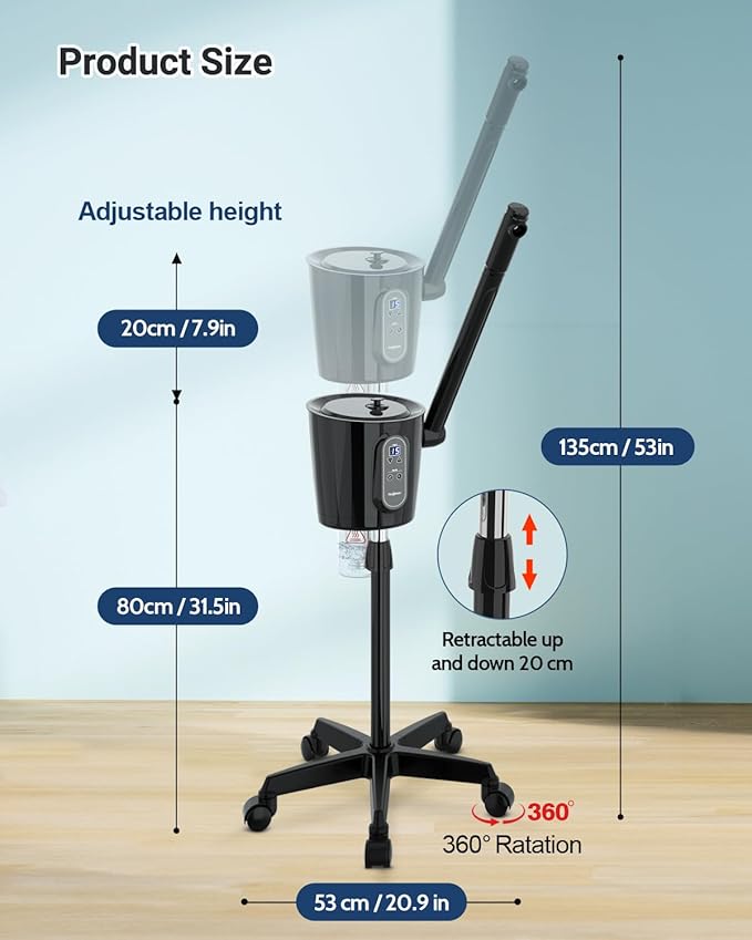- 【Detachable, Height-Adjustable Design】With a detachable, easy-to-clean water cup and a height-adjustable stand, this steamer is built for convenience. Adjust the height and enjoy a 360° rotating nozzle, perfect for a personalized, comfortable treatment while sitting or lying down. The wheeled stand offers effortless mobility, suiting both home and salon use