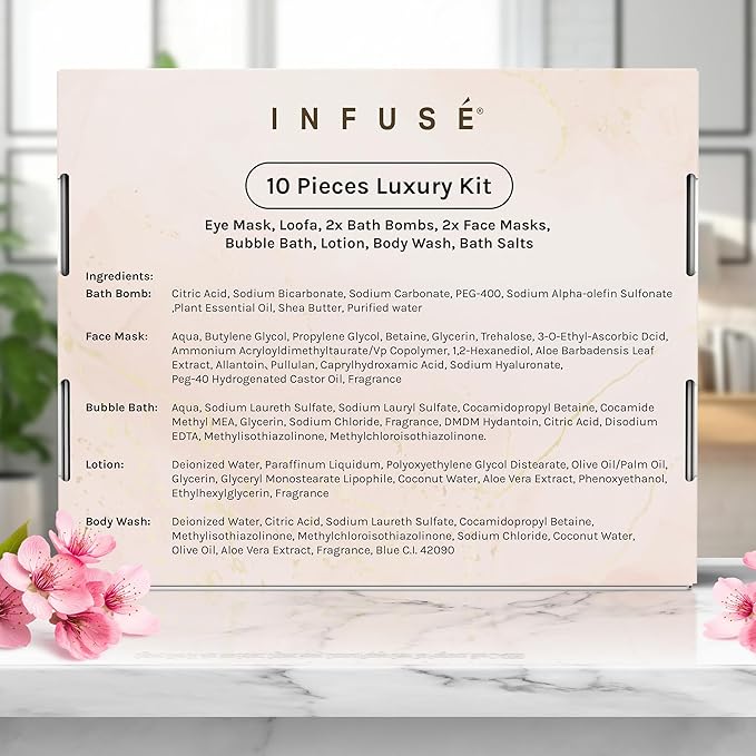 - COMPLETE SPA ESSENTIALS: Spoil her with this 10-piece spa gift box, packed with essentials like body wash, bubble bath, a cozy eye mask, exfoliating loofah, two bath bombs, bath salt, hydrating lotion, and two rejuvenating face masks. This box delivers a pampering treat she’ll treasure. It’s a heartfelt gift for women who deserve a moment of relaxation. Whether it's for mom, wife, or a dear friend, this set is designed to elevate her self-care routine and bring a touch of luxury into her life.