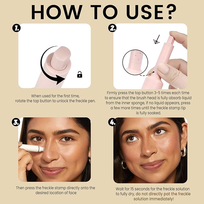 - Use Method: When used freckle stamp pen for the first time, rotate the top button to unlock the freckle pen. Firmly press the top button 2 times each time to ensure that the brush head is fully absorb liquid from the inner sponge.Then press the freckle stamp directly onto the desired location of face.Wait for 15 seconds to allow the freckle-removing liquid to dry completely. Do not pat the freckle-removing liquid immediately!